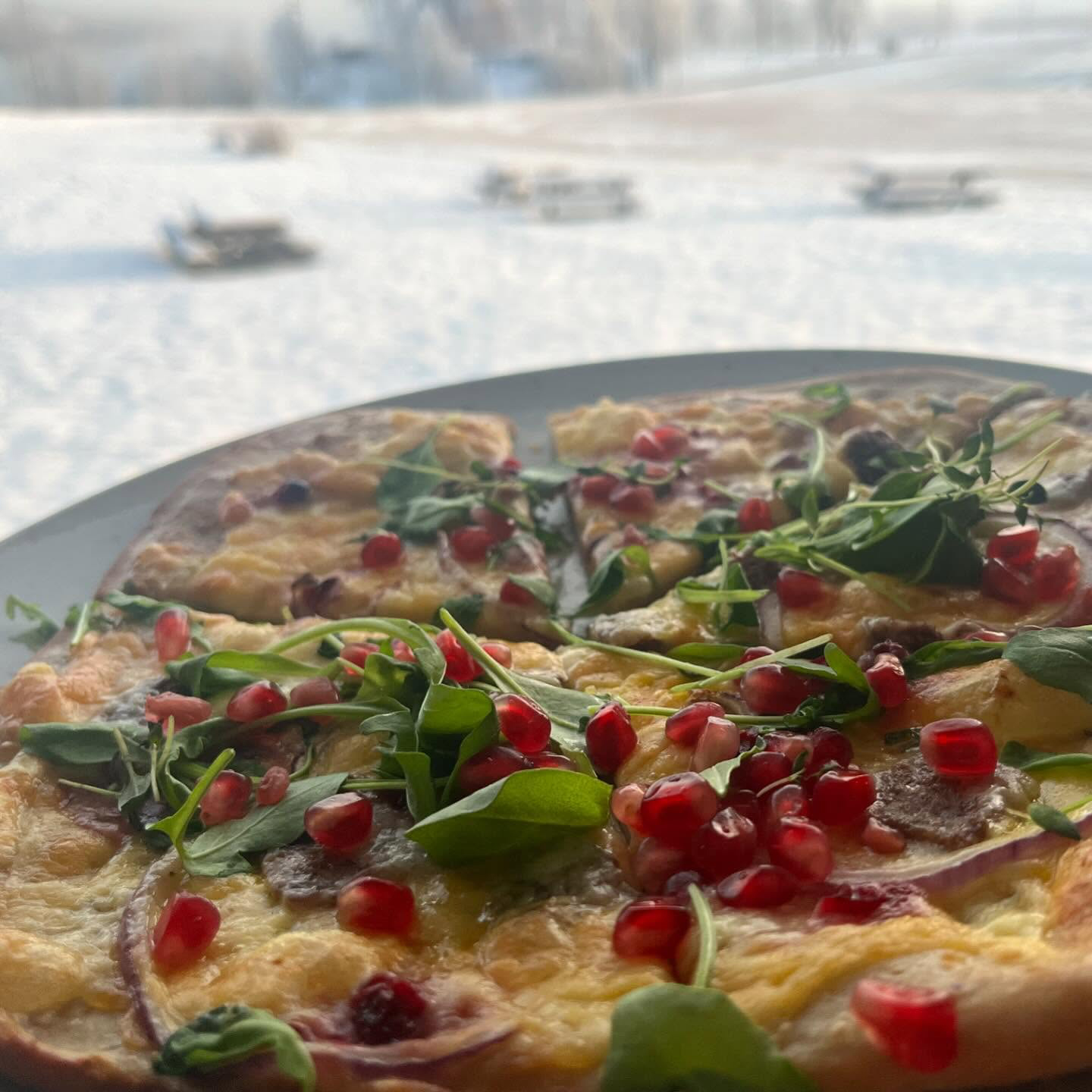 Altså, denne pizzaen! Dette er vår ny (vinter)pizza med reinsdyrskrav, tyttebær og granateple, og med hjemmelaget hvit pizzasaus Det må prøves!